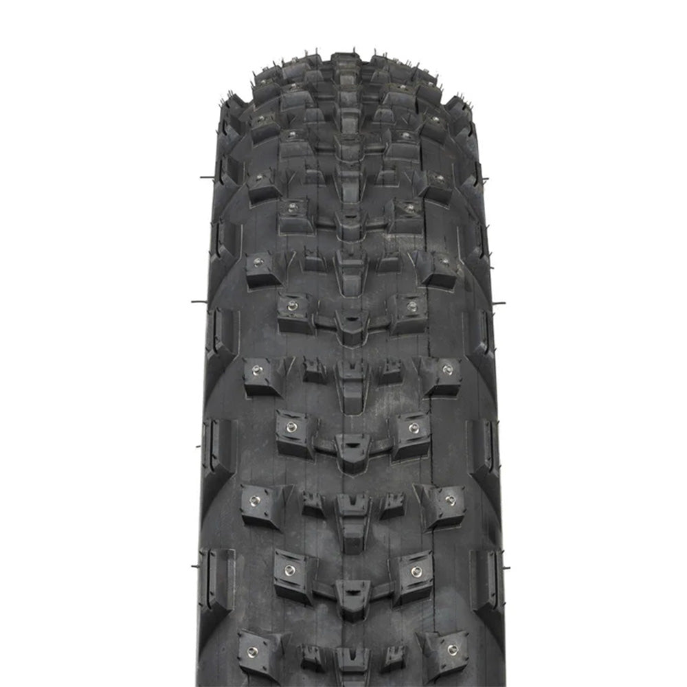 Dillinger 4 is a fast traction studded fat bike tire. The tightly spaced center tread rolls quickly, while taller, braced side lugs improve cornering in snowy conditions. Carefully positioned studs allow for railing icy, off-camber singletrack with confidence and control.